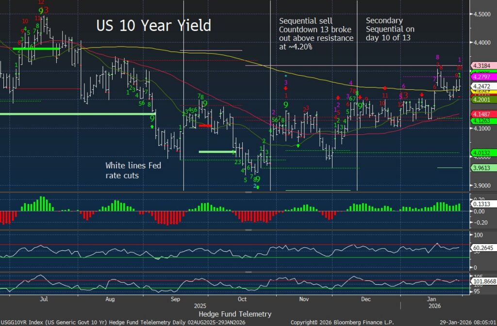 US 10-Year Yield is steady today now on day 10 of 13 with Sequential and upside resistance now at 4.30%