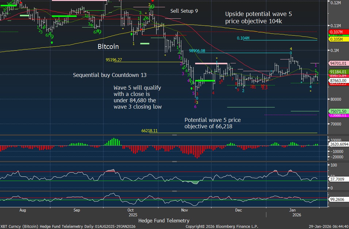 Bitcoin Daily “Remember me?” Nobody talks about crypto these days! Risk remains still to the downside and on the daily chart if the wave 3 closing low and perhaps 80k (Big round number) breaks then the downside risk would increase.