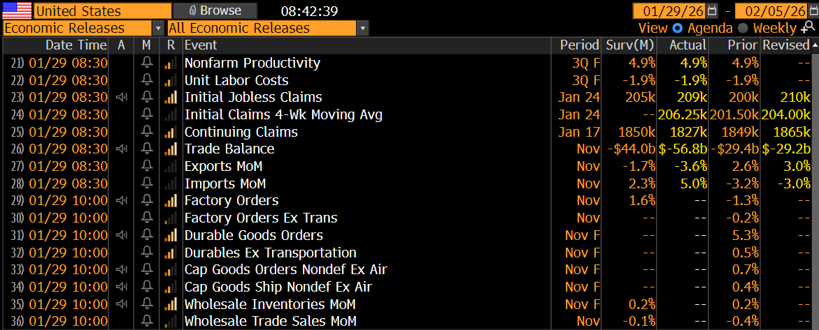 - Data today: Q3 unit labor costs, initial claims (205K est.), Nov trade balance, factory orders