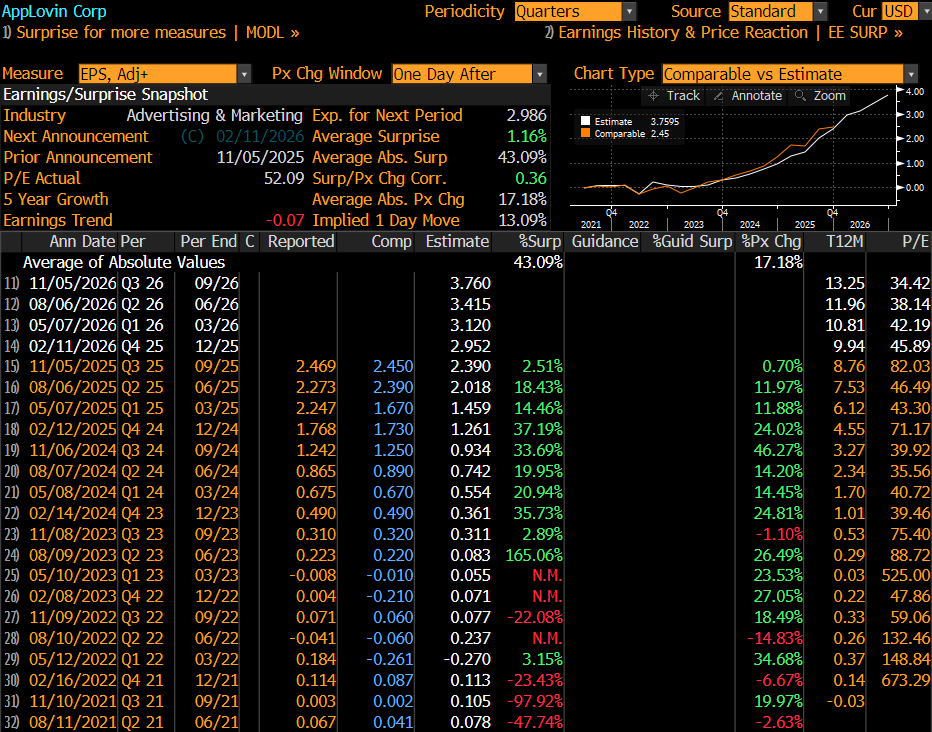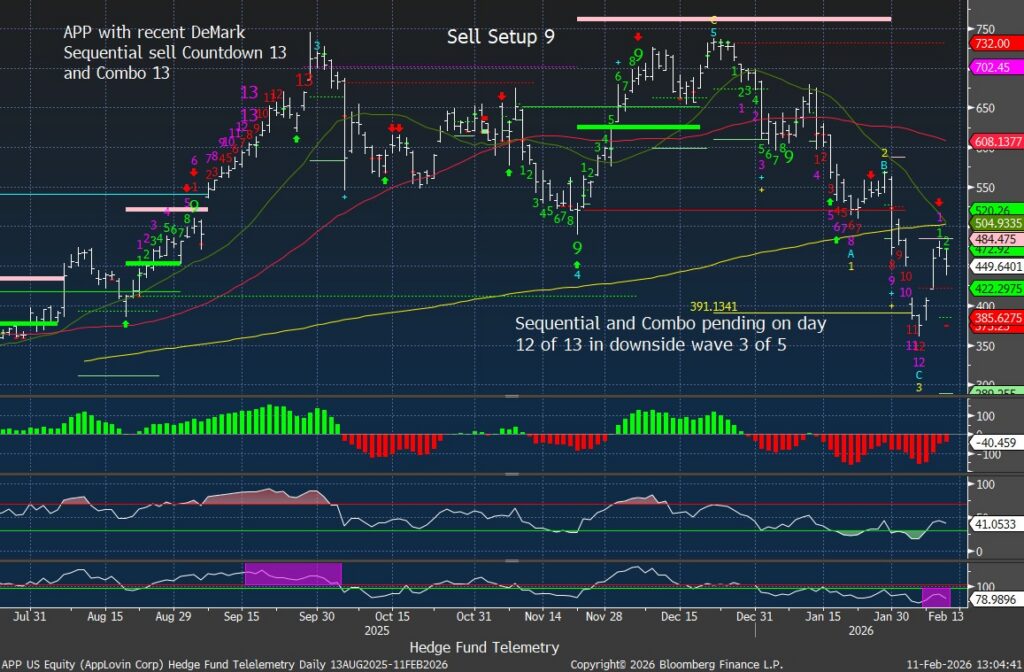 APP (AppLovin) reports Wednesday after the close with fundamentals still well-liked, though recent tech volatility has raised sensitivity around high-multiple momentum names. The core monetization and platform leverage story remains intact, but positioning increases the importance of guidance. The Street expects EPS +70% to $2.95, EBITDA +57% to $1.33B, and revenue +17% to $1.61B. The reaction will hinge more on forward margin sustainability than Q4 upside. I have traded this one well despite the wild moves. I recently covered the remainder of this due to the decline (duh), the pending DeMark buy Countdown 13’s – this only got to day 12 so it is is possible if this is down or flat tomorrow. Add in the heavy put buying that caused this upside squeeze. I will happily sit this one out with the implied move and average price move after earnings more than my liver can handle. Sometimes after doing well at a Blackjack table it’s good to walk away for a while.