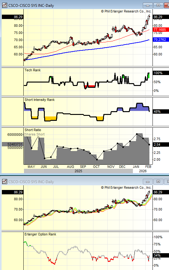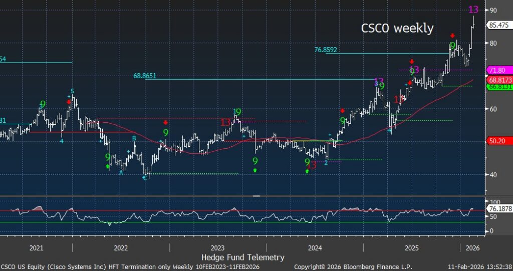 CSCO (Cisco) reports FQ2 Wednesday after the close with sentiment quietly bullish following several quarters of consistent execution. The company benefits from solid enterprise and data center demand, selective AI exposure, reasonable valuation (<20x PE), and dependable capital return. The Street models revenue +8% to $15.1B (Networking +14.7%), gross margins of 68%, and EPS of $1.02. Investors will focus on order momentum, AI-related networking demand, and backlog trends. The last earnings report gapped higher and faded. This move might have cleared out some recent shorts thus limiting squeeze potential. I’ll sit this one out but I’d lean slightly (barely) long as they will highlight how wonderful their AI stuff is like they did last quarter