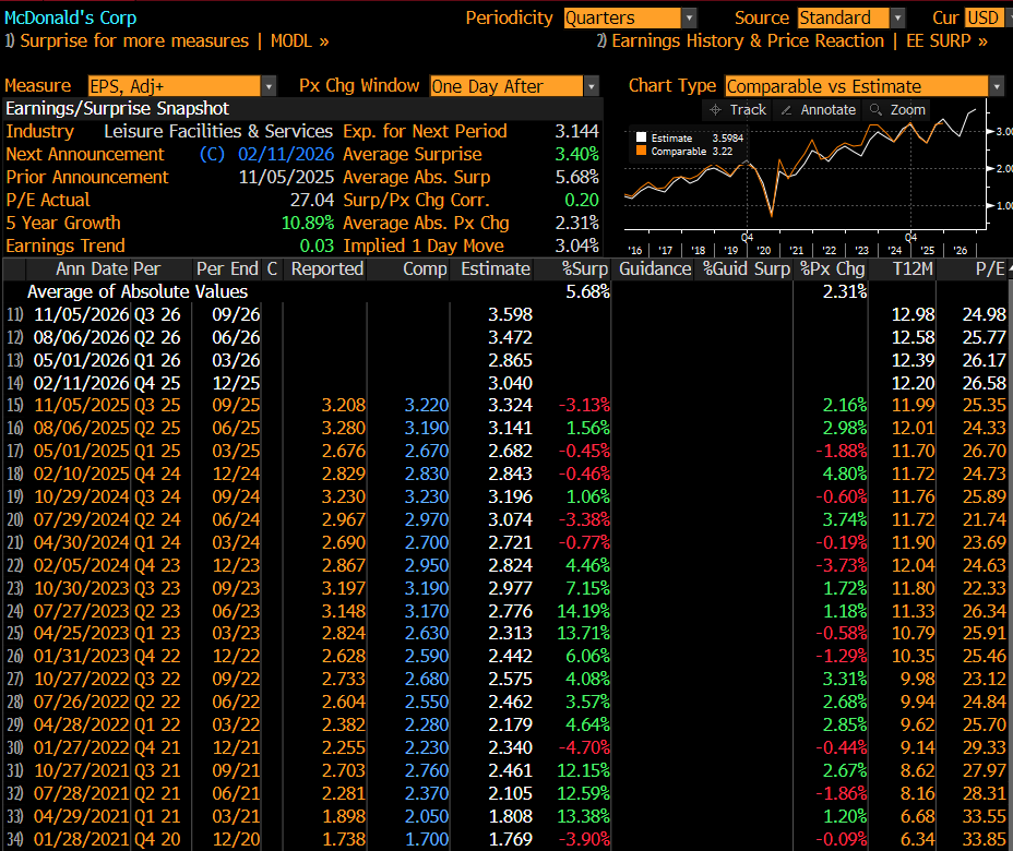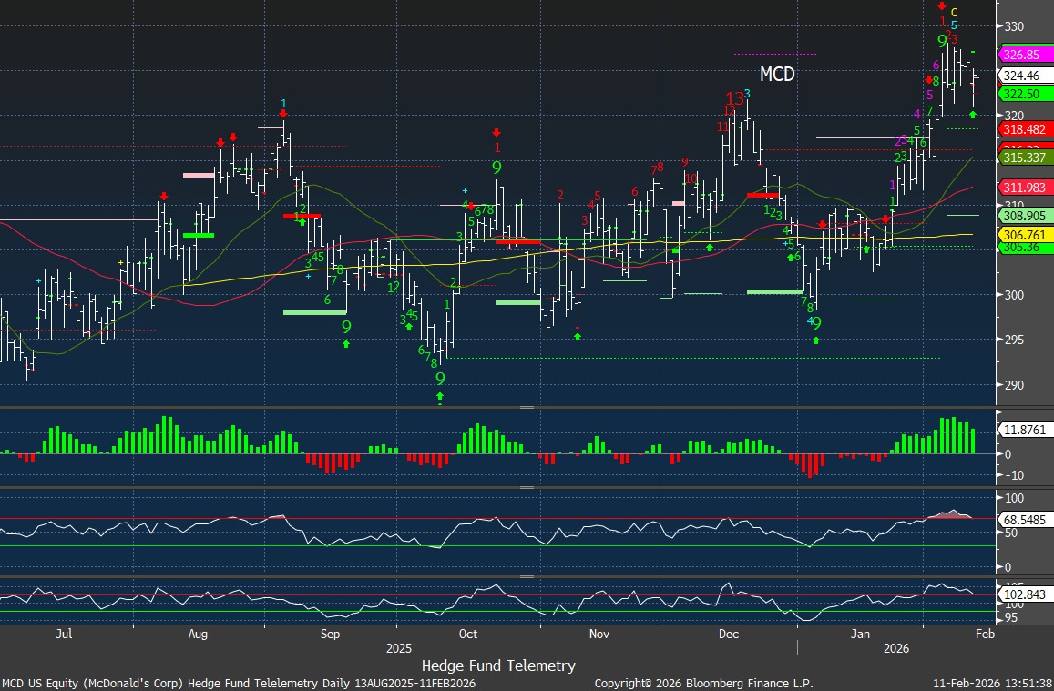MCD (McDonald’s) reports FQ4 Wednesday pre-open with sentiment steady and constructive, as investors increasingly view the stock through a staples/defensive lens rather than discretionary. The company is expected to leverage scale, value positioning, and operating discipline to capture share in a mixed consumer backdrop. The Street is modeling comps of +3.7% (US +4.8%), operating margins of 45.8%, and EPS of $3.02. Focus will be on US traffic durability and margin resilience more than the headline beat. MCD tends to move on comps and with the stock poking higher there is potential for it to continue however since this rarely moves more than 3% and a slight concern is high call buying. Sidelines.