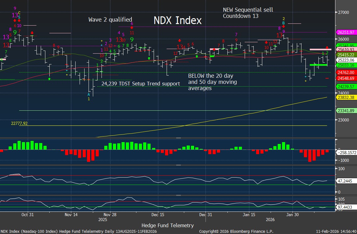 S&P 500 Index daily nothing new to report with the action still in a range. The red arrow down is a DeMark Camouflage. Gap up, below open but still up on the day. A sign of underlying selling. Happening on NDX too