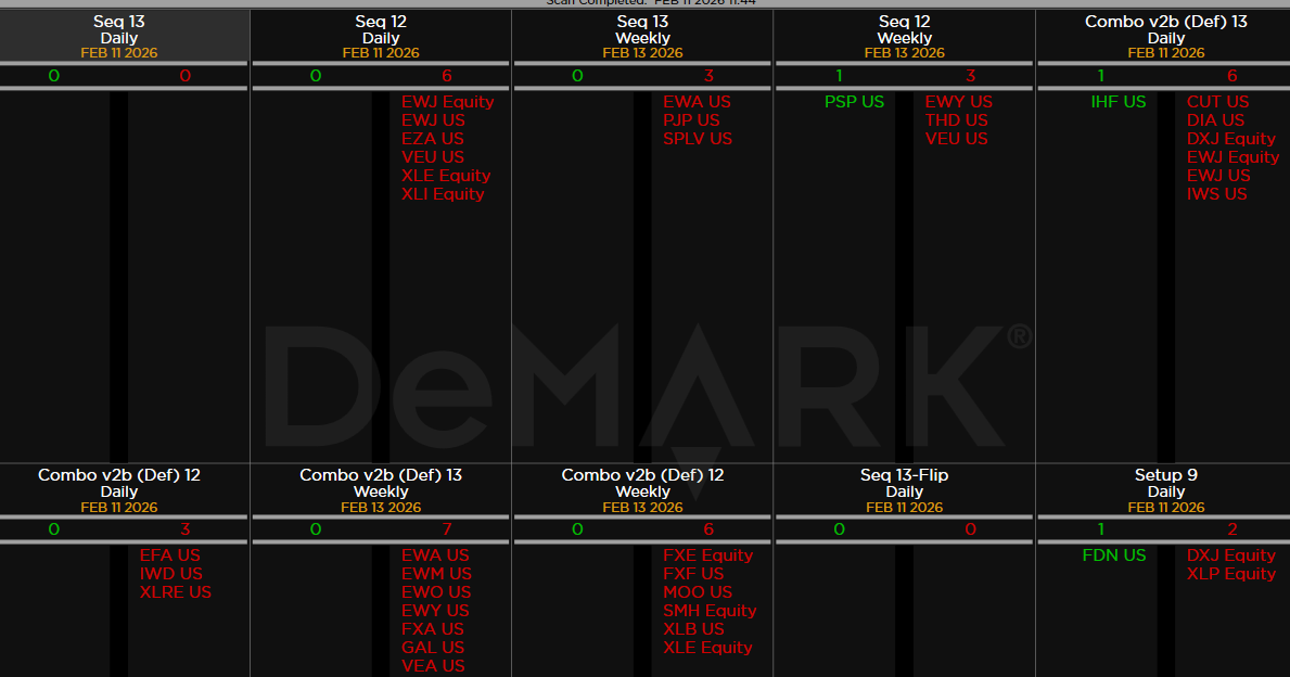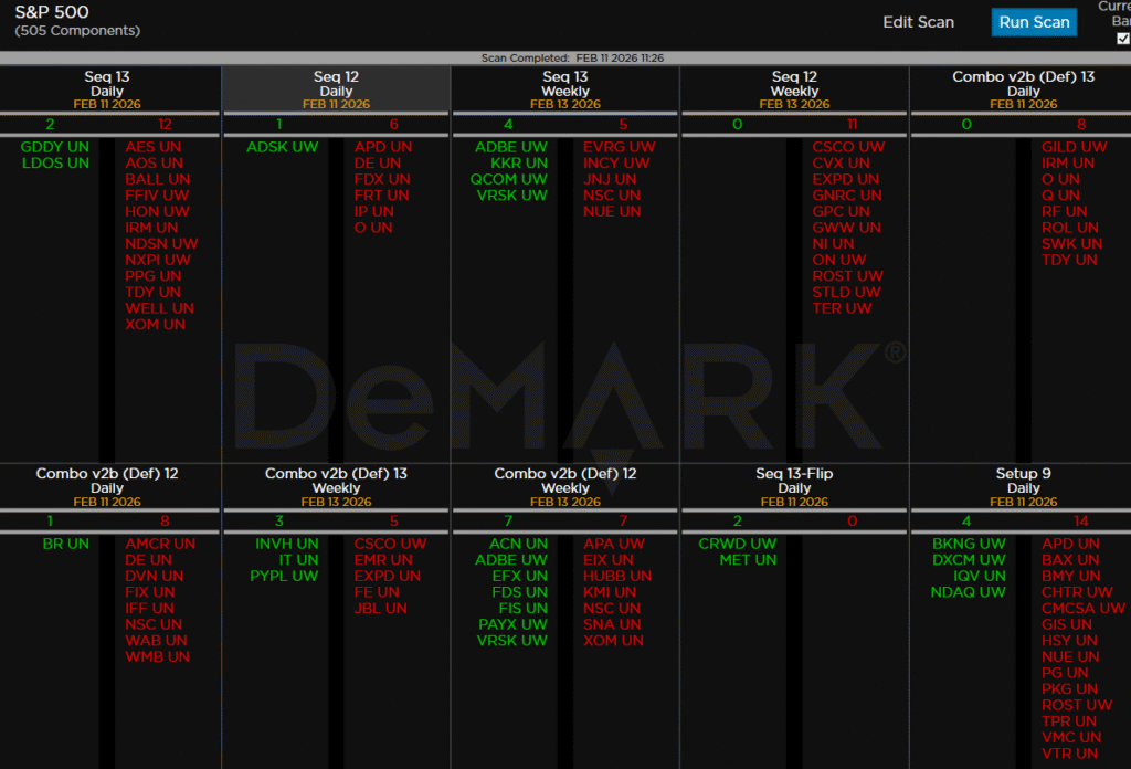Within the S&P 500, the DeMark Sequential and Combo Countdown 13s and 12/13s on daily and weekly periods. Green = buy Setups/Countdowns, Red = sell Setups/Countdowns. Price flips are helpful to see reversals up (green) and down (red) for idea generation. The extra letters at the end of the symbols are just a Bloomberg thing. Worth noting: Seeing more sell signals on daily and weekly time frame. Perhaps some names you’re following? XOM, FDX, CSCO, DE