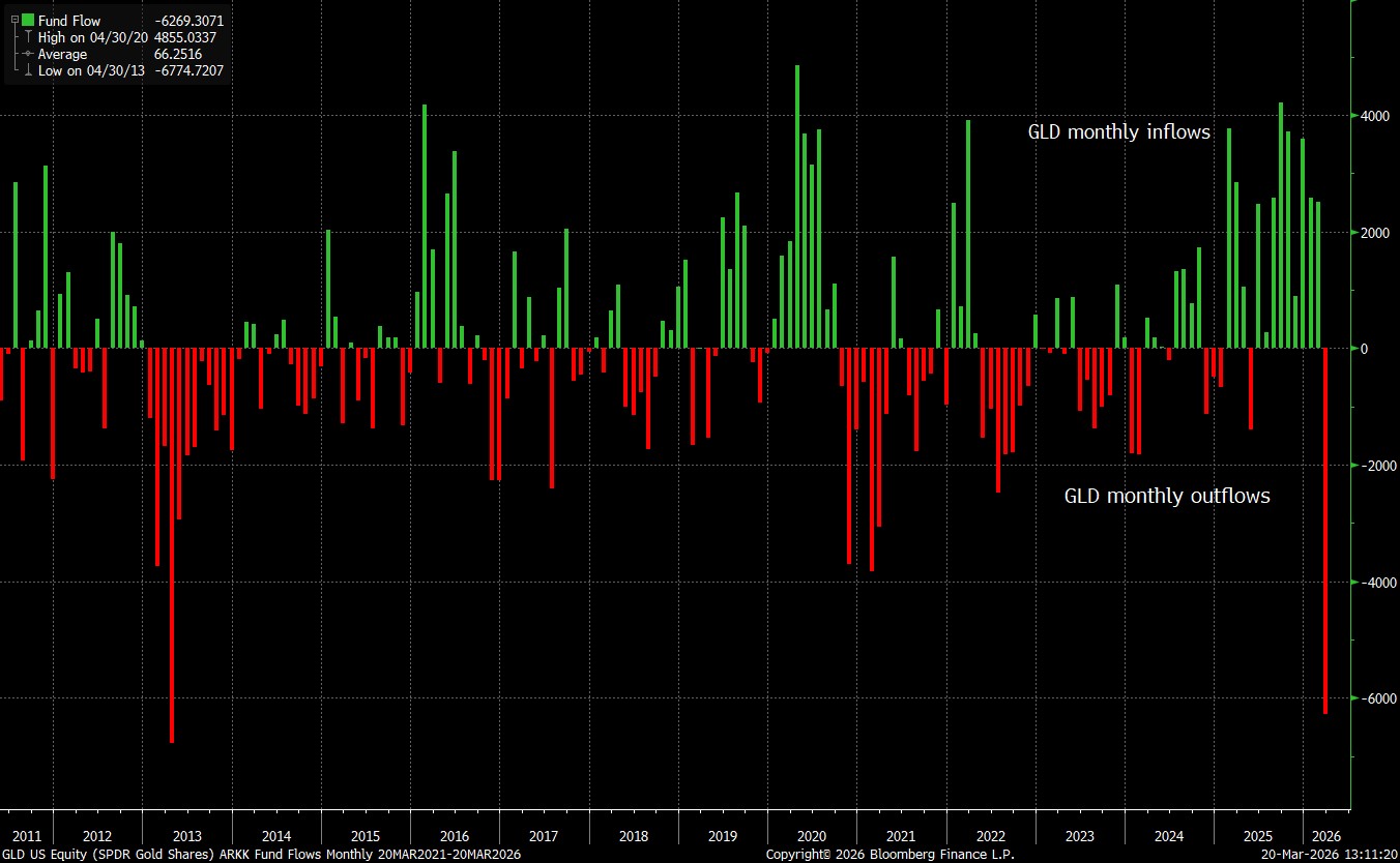 • Gold and metals have a narrative of being a safe hiding place, yet gold is also like bonds, an easy liquidity asset. Add that inflows into gold and metals have been at higher levels over the last 6 months, which has people trapped higher. At times of stress, funds and investors will look for liquidity, selling anything not nailed down.