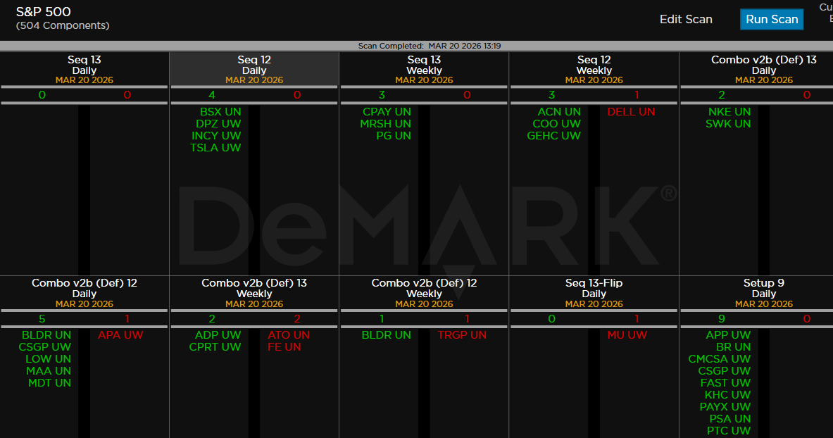 Within the S&P 500, the DeMark Sequential and Combo Countdown 13s and 12/13s on daily and weekly periods. Green = buy Setups/Countdowns, Red = sell Setups/Countdowns. Price flips are helpful to see reversals up (green) and down (red) for idea generation. The extra letters at the end of the symbols are just a Bloomberg thing. Worth noting: Starting to see some buy signals but not nearly enough to turn bias