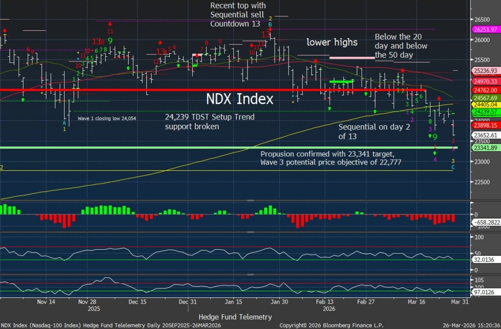 Nasdaq-100 Index breaking daily lows, with a potential start of a new Sequential on day 2 of 13. Downside wave 3 and Propulsion downside targets.