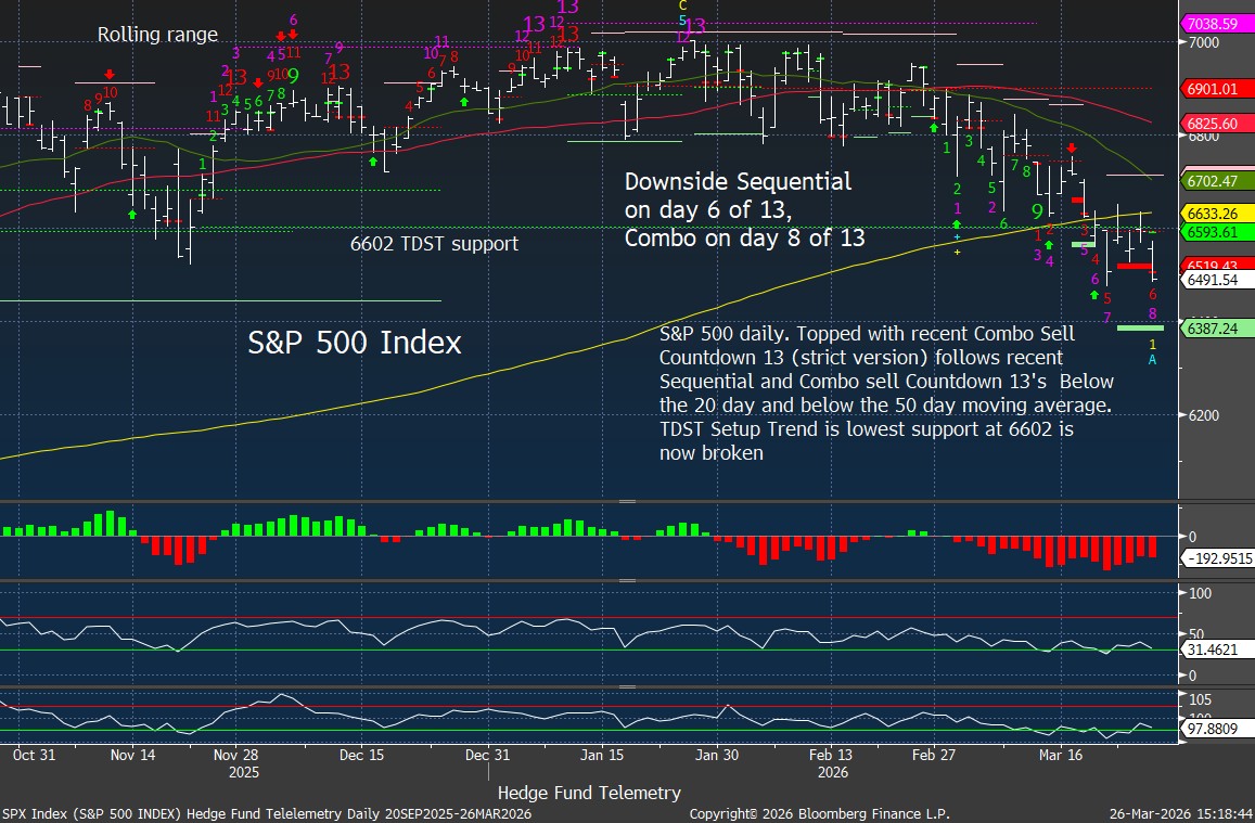 S&P 500 Index daily with downside DeMark Sequential and Combo Countdowns in progress. Potential new downside Propusion target of 6387 is qualified but will need to confirm tomorrow – I’ll let you know if it confirms. This is one of DeMark only indicators that works on offense vs defensive exhaustion signals.