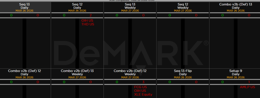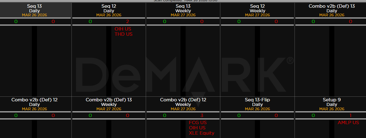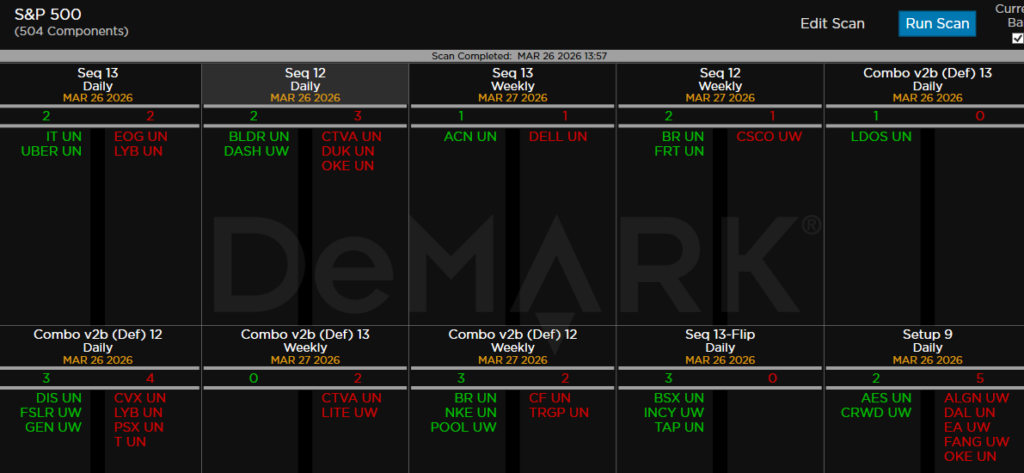 Within the S&P 500, the DeMark Sequential and Combo Countdown 13s and 12/13s on daily and weekly periods. Green = buy Setups/Countdowns, Red = sell Setups/Countdowns. Price flips are helpful to see reversals up (green) and down (red) for idea generation. The extra letters at the end of the symbols are just a Bloomberg thing. Worth noting: A few buy and sell signals yet no patterns yet.