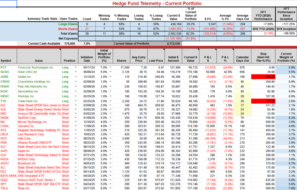 Current Portfolio Ideas: New high water mark for 2026 +7.6% vs S&P -5%. 8% cash, 52% net short.