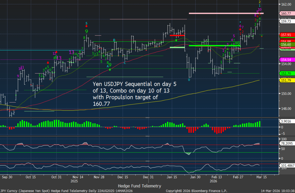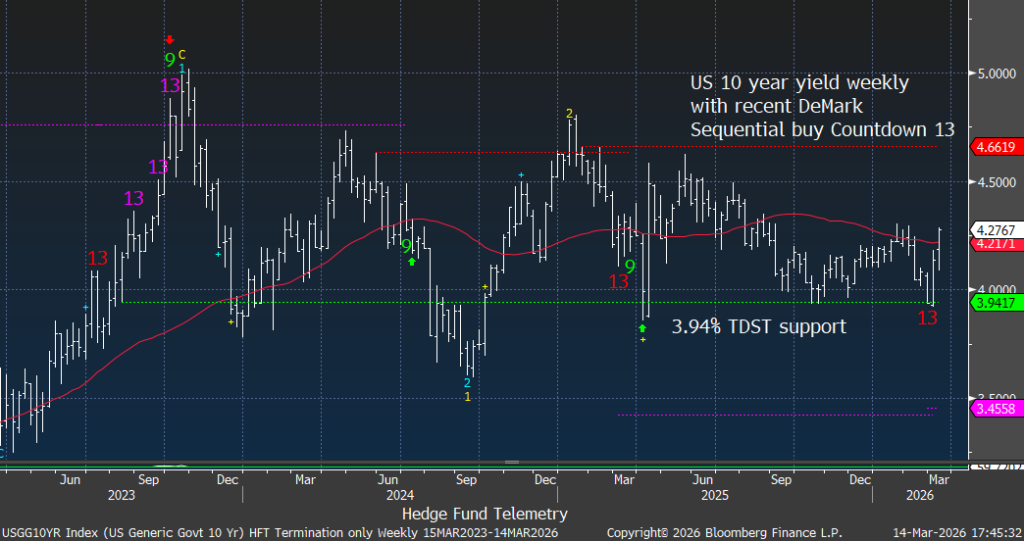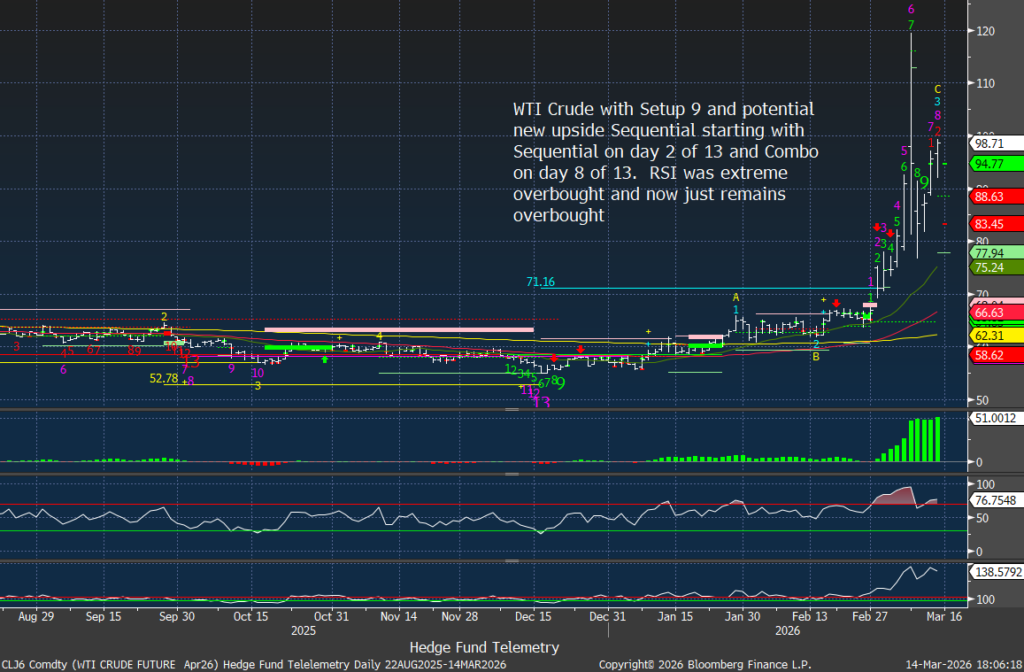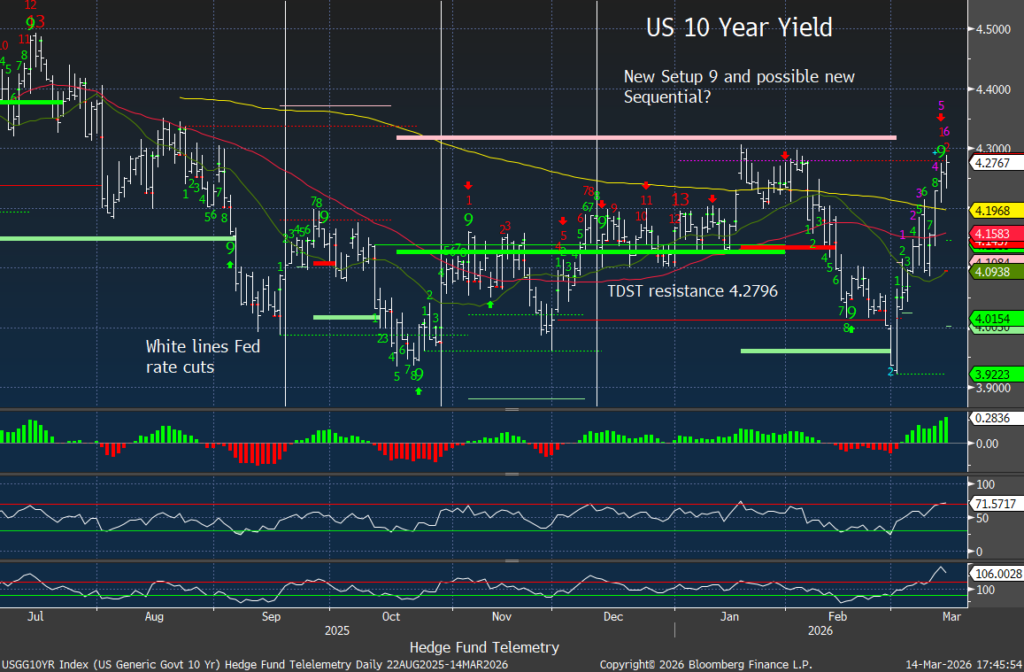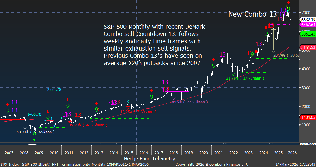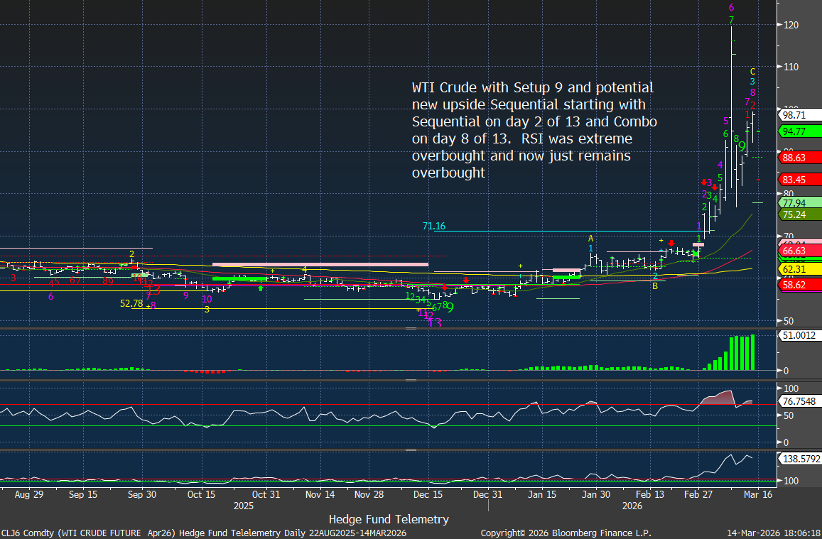 The geopolitical premium created by the Iran conflict and the disruption of the Strait of Hormuz has driven oil prices sharply higher. This acts as a tax on the global economy while also forcing markets to reprice expectations for central bank easing. We need to watch if the Sequential starting up on day 2 of 13 continues as this could get worse.