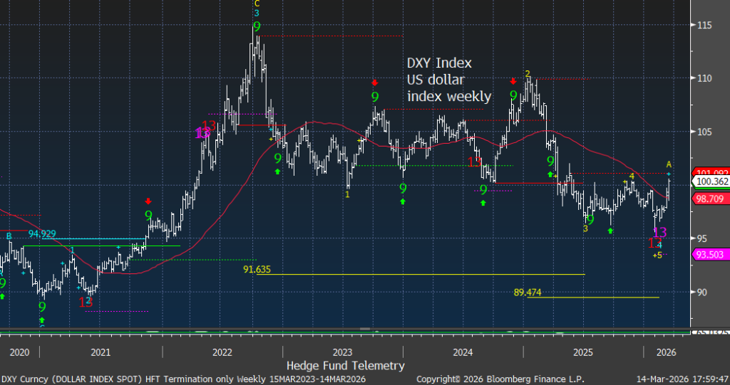 The weekly time frame for the US Dollar Index recently had DeMark Sequential and Combo buy Countdown 13s at the lows. TDST Setup Trend resistance is 101.09
