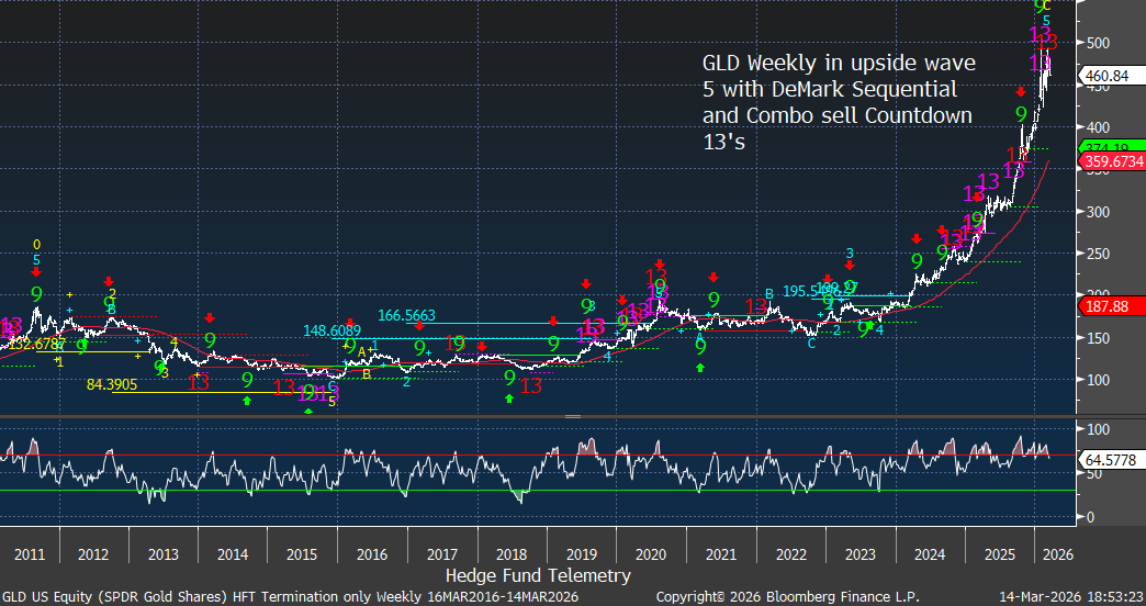 Takeaway: Gold remains structurally strong but is also has technical exhaustion with overbought conditions.