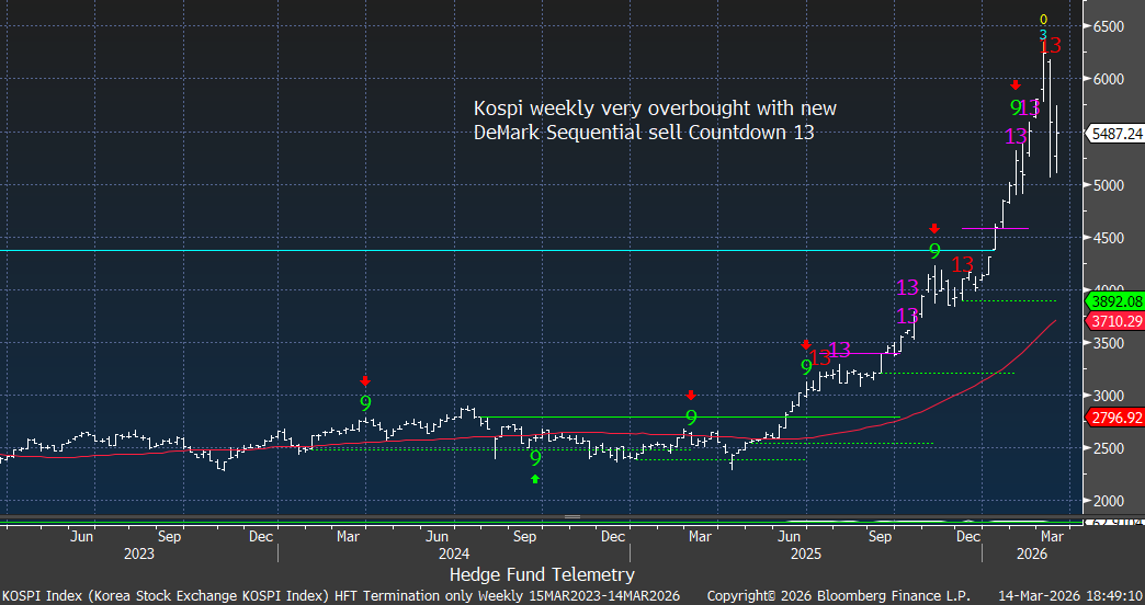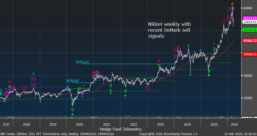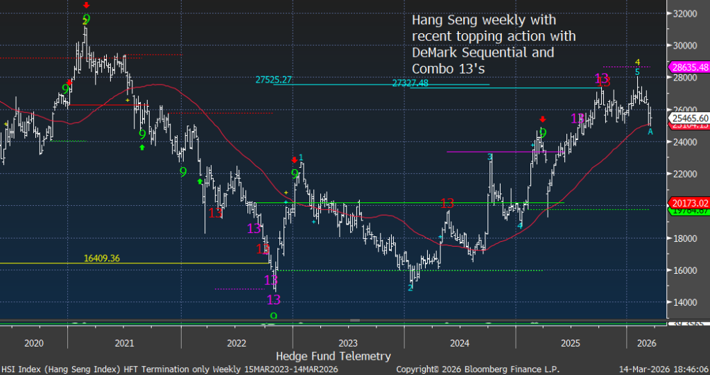 The Nikkei and Kospi charts both show DeMark sell signals after powerful advances, while the Hang Seng displays topping behavior following exhaustion signals in 2025. Global equity markets appear synchronized in maturity. These markets are very crowded for investors looking outside of the US markets.