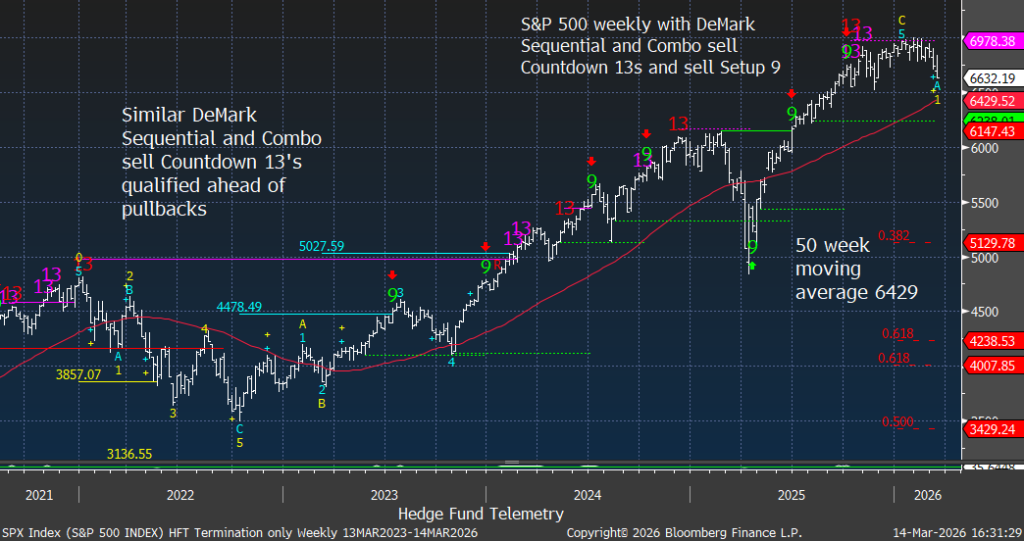Our bias is cautious but not outright bearish in the very near term. A headline-driven squeeze remains possible if Washington signals an off-ramp with Iran, but the probability of a sustained breakout above recent highs appears lower than that of a further downside rotation beneath the surface. Internals have weakened materially. DeMark exhaustion signals remain relevant on longer time frames; sentiment is deteriorating rather than washed out; and cross-asset behavior suggests fragility is building faster than the index level alone indicates.