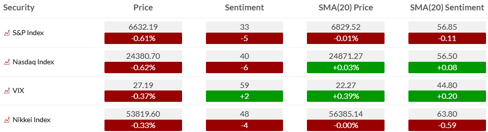 - Nasdaq sentiment: 40, below its 20-day sentiment average of 56.50.