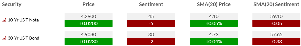 - 30-year bond sentiment: 38, below its 20-day average of 57.65.