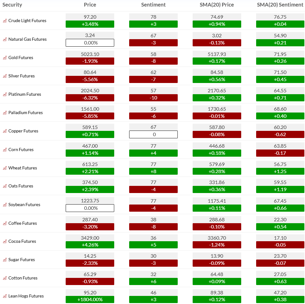 - Gold sentiment: 58 but below its 20-day sentiment trend, suggesting safe-haven enthusiasm has cooled tactically after a strong prior run.