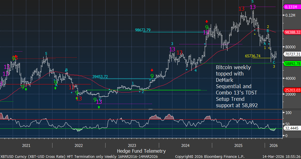 Bitcoin rolled over after registering DeMark exhaustion signals. Crypto often functions as a barometer of speculative risk appetite, and weakening momentum reinforces the message from equity internals. Achieved downside wave 3 of 5 price objective of 65k. A corrective wave 4 bounce is possible and would qualify with a 13 week closing high. So it will take some time if the bounce qualifies wave 4 of 5. Breaking the TDST Setup Trend support at 58,892 could see a much further decline.