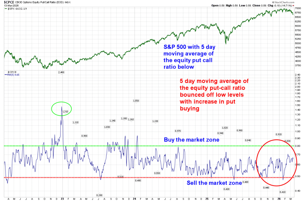 The 5-day moving average of the equity put/call ratio has risen toward historically elevated levels but has not yet reached the capitulation zone typically associated with durable market bottoms.