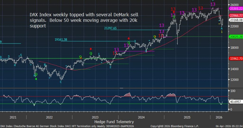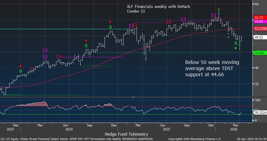 Financials have already rolled over more than the other cyclical leaders. The chart highlights a weekly DeMark Combo 13, and unlike Energy, this one has been followed by visible price deterioration. Most important, XLF is now below the 50-week moving average.