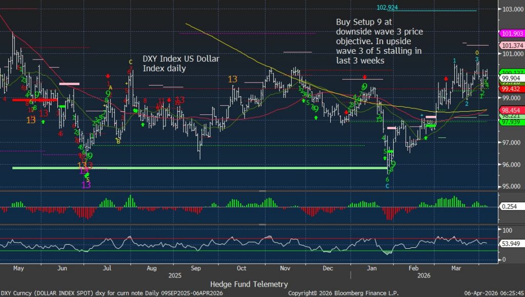 - DXY: Weekly buy 13 completed → dollar bottom likely in yet at resistance on daily time frame
