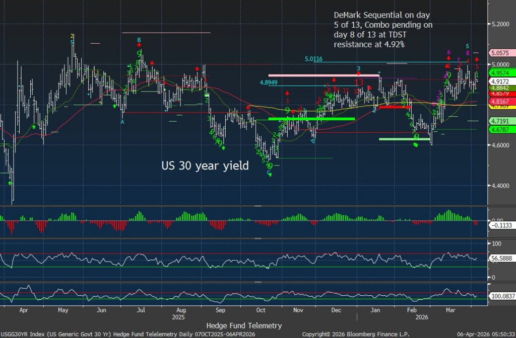 US 30 year yield with upside DeMark Sequential in progress nearing 5% resistance and likely alarm bell level