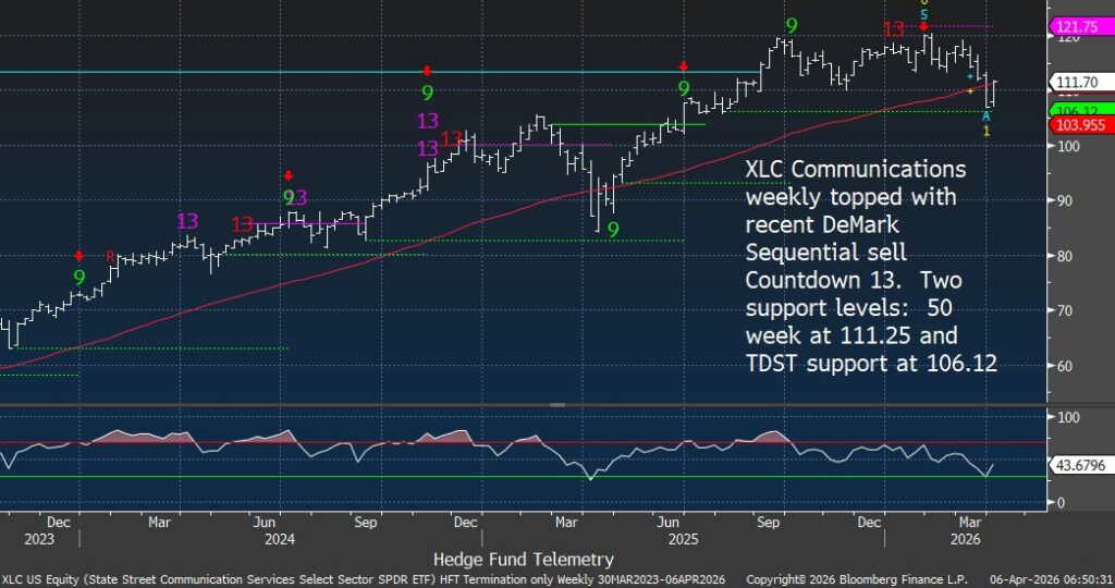 | XLC – Communications | Sequential Sell Countdown 13 | Just Above (at risk) | 50W 111.25 / TDST 106.12 | Near-term decision point. Lose 50W → trend break risk increases quickly. |