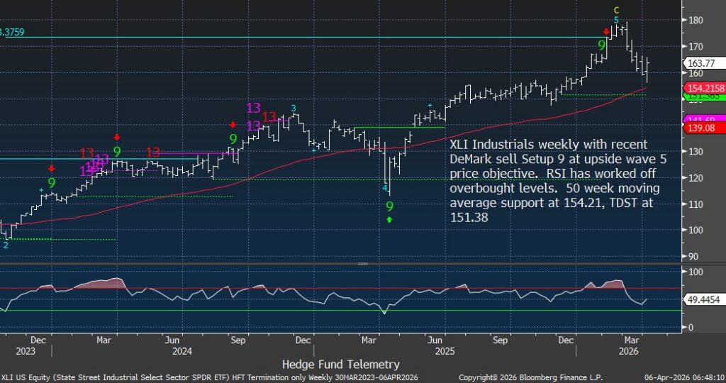Industrials have corrected from a strong trend but have not fully broken. The key DeMark point is the recent weekly sell Setup 9 at an upside wave 5 objective, which is classic language for a maturing advance. The chart also notes RSI has worked off overbought levels, which is constructive. Price remains above the 50-week moving average.