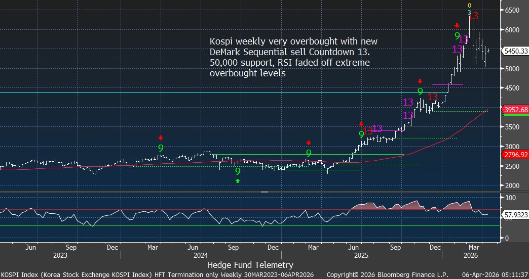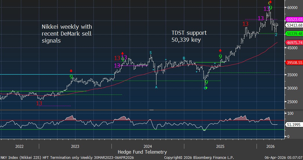 XLE is still clearly above the 50-week, so trend is intact and energy remains one of the strongest sector tapes. But this is a classic case where strong trend and poor entry can coexist. The DeMark 13s plus overbought RSI argue for a pause, shakeout, or at minimum reduced upside asymmetry near-term.