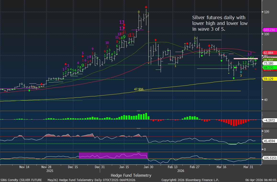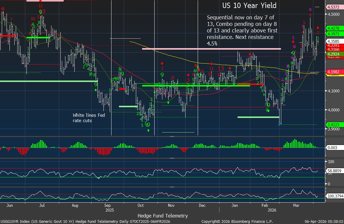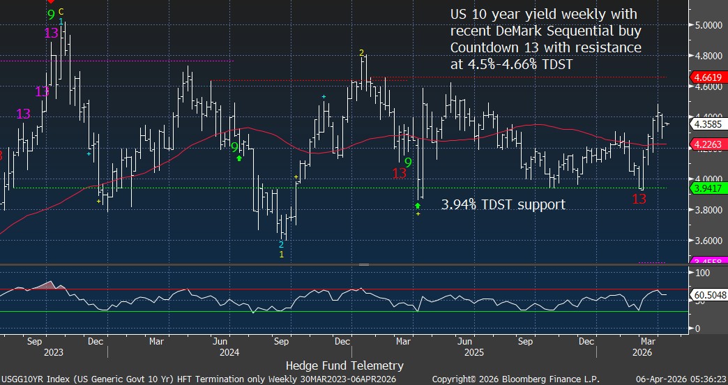 - 10Y: Weekly buy Countdown 13 → yields bottoming, resistance ~4.5–4.6%