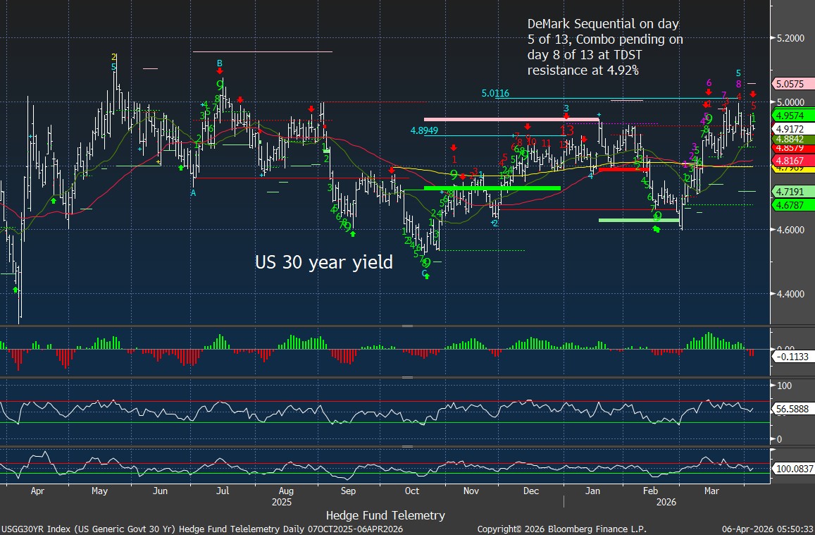 US 30 year yield with upside DeMark Sequential in progress nearing 5% resistance and likely alarm bell level