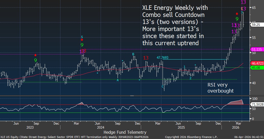 Energy is the standout upside extension. The chart shows weekly Combo sell Countdown 13s and, more importantly, those 13s developed within the current uptrend, which makes them more relevant from an exhaustion standpoint. RSI is also explicitly flagged as very overbought.