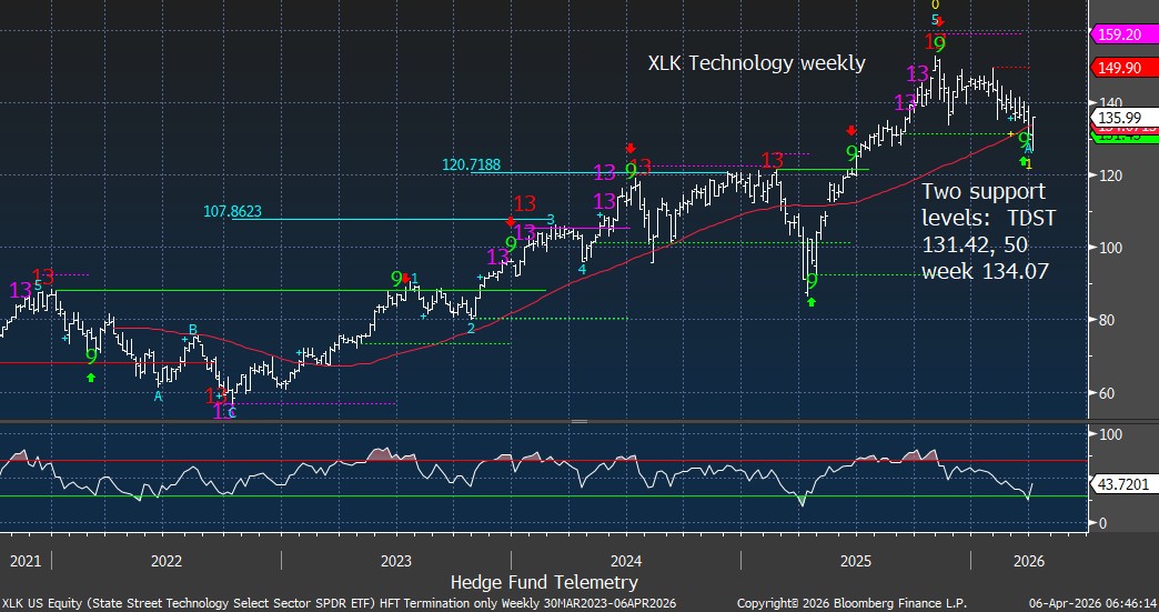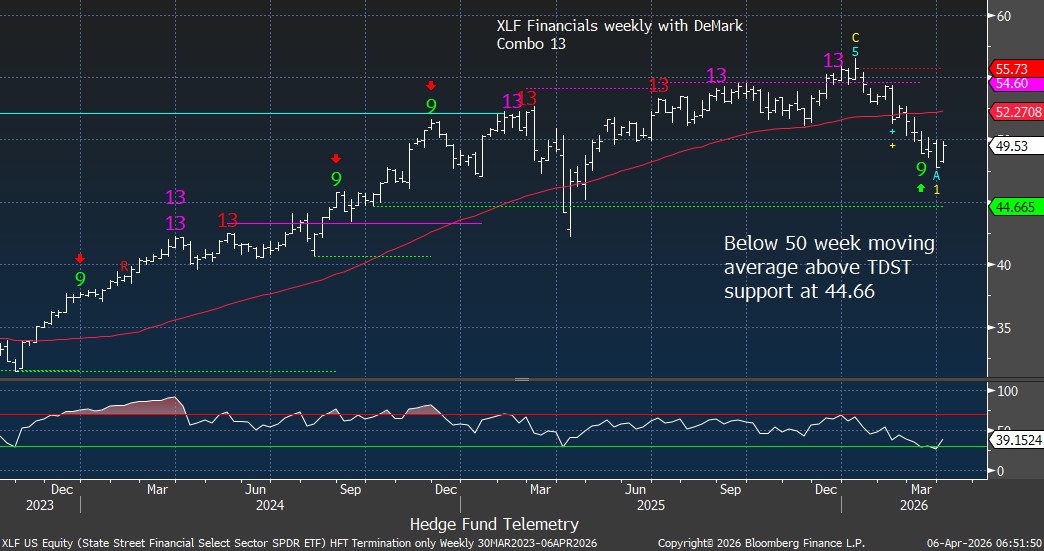 Financials have already rolled over more than the other cyclical leaders. The chart highlights a weekly DeMark Combo 13, and unlike Energy, this one has been followed by visible price deterioration. Most important, XLF is now below the 50-week moving average.