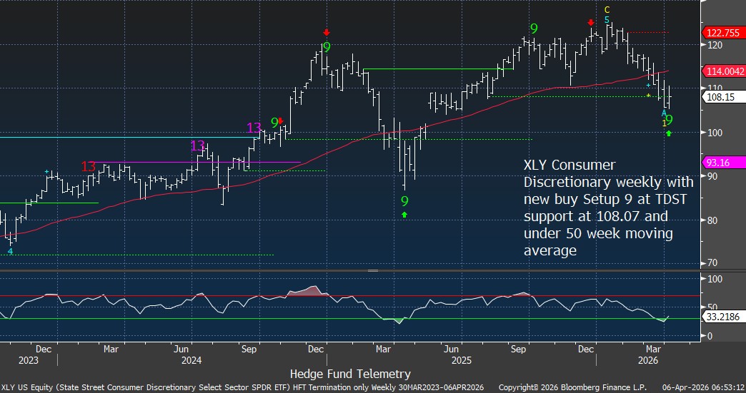 The buy Setup 9 says a tactical low may be forming, but from the framework, this is still a countertrend recovery attempt until XLY can get back above the 50-week. That moving average is the line that needs to be reclaimed to argue the sector is repairing. If XLY fails and loses 108.07 TDST, the buy signal likely fails and downside risk re-expands.
